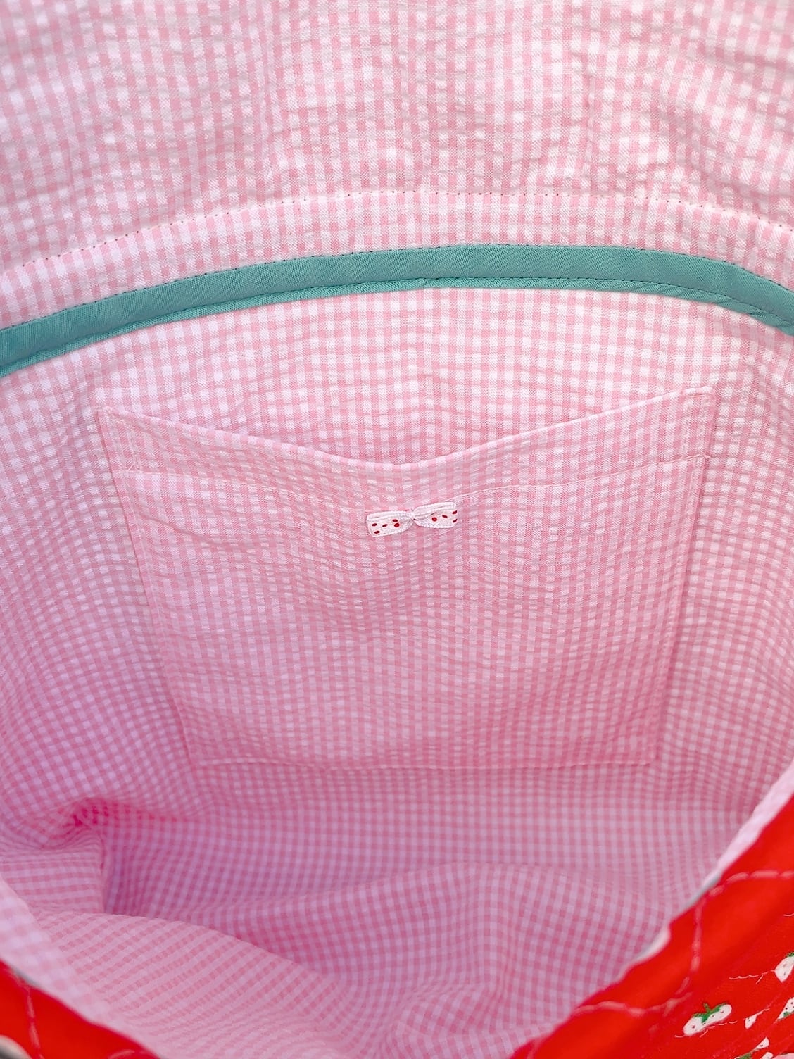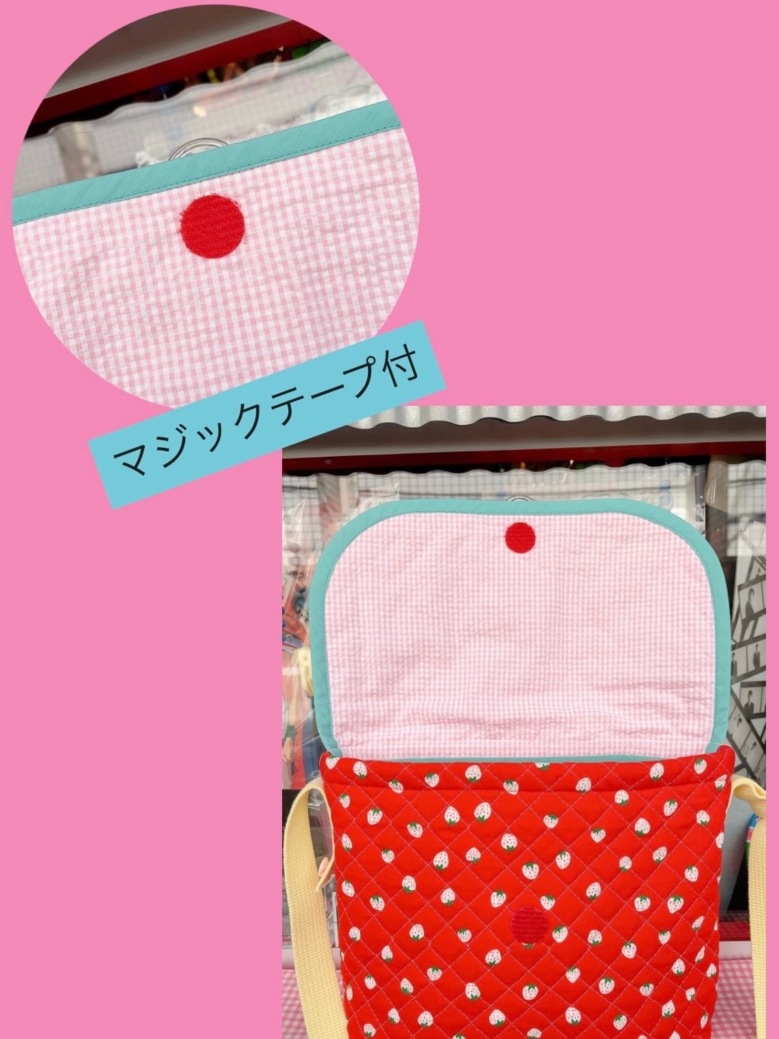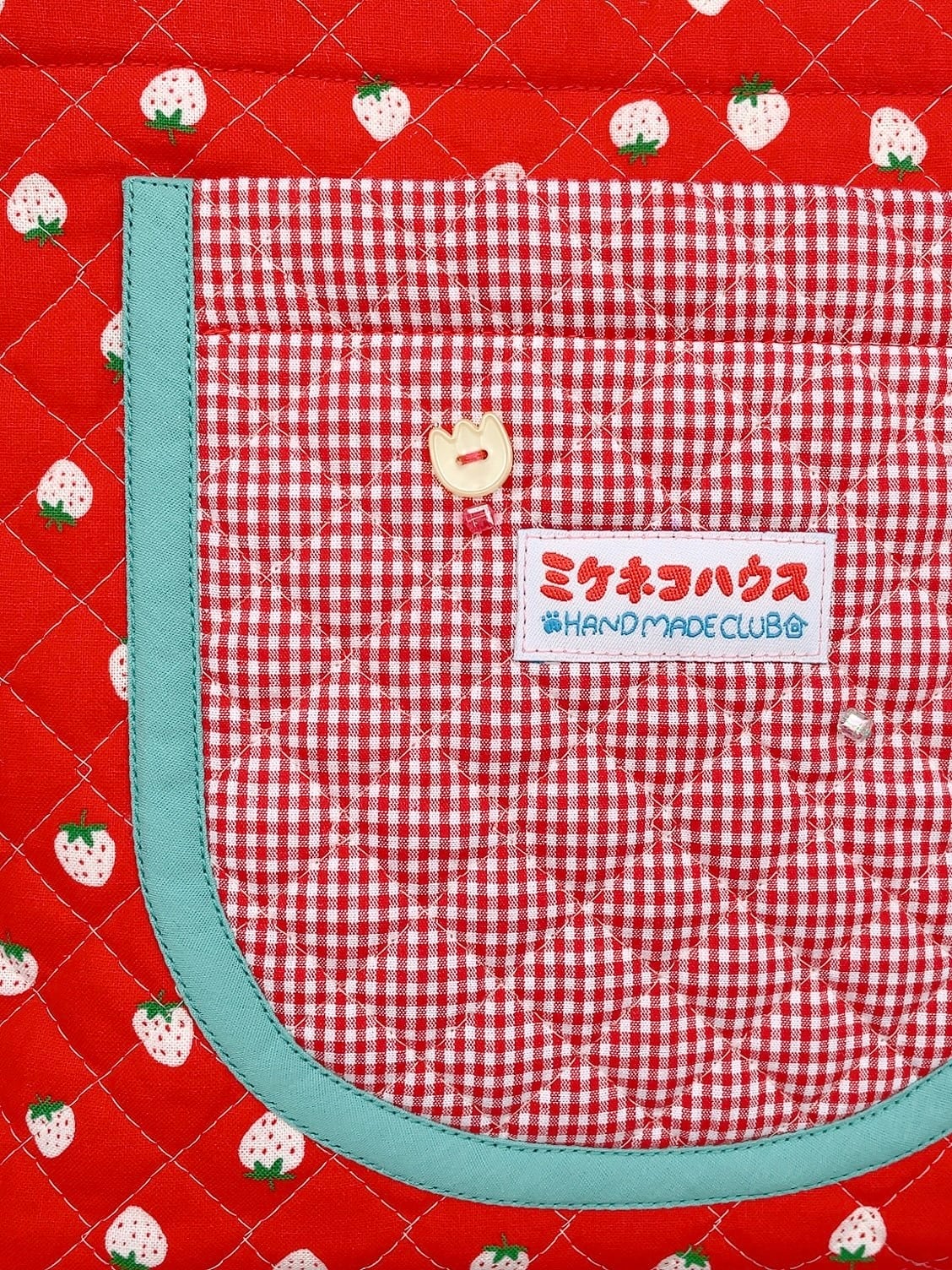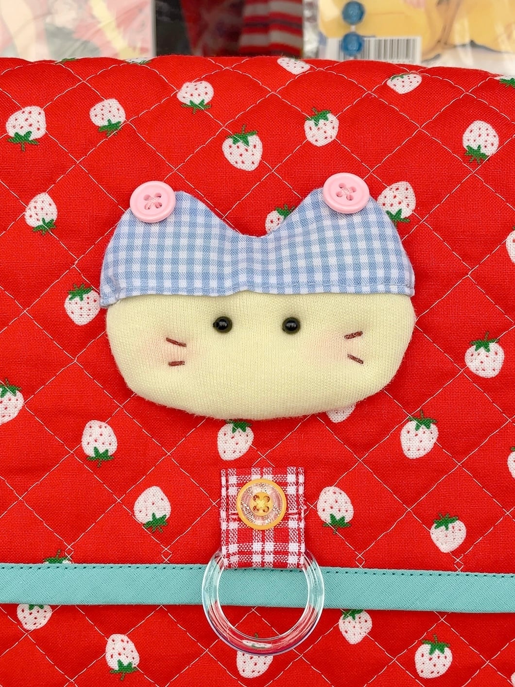 いちごたくさんウキウキなかばん完成しました➰今回のゲストはギンガムチェック帽子のネコ氏♪